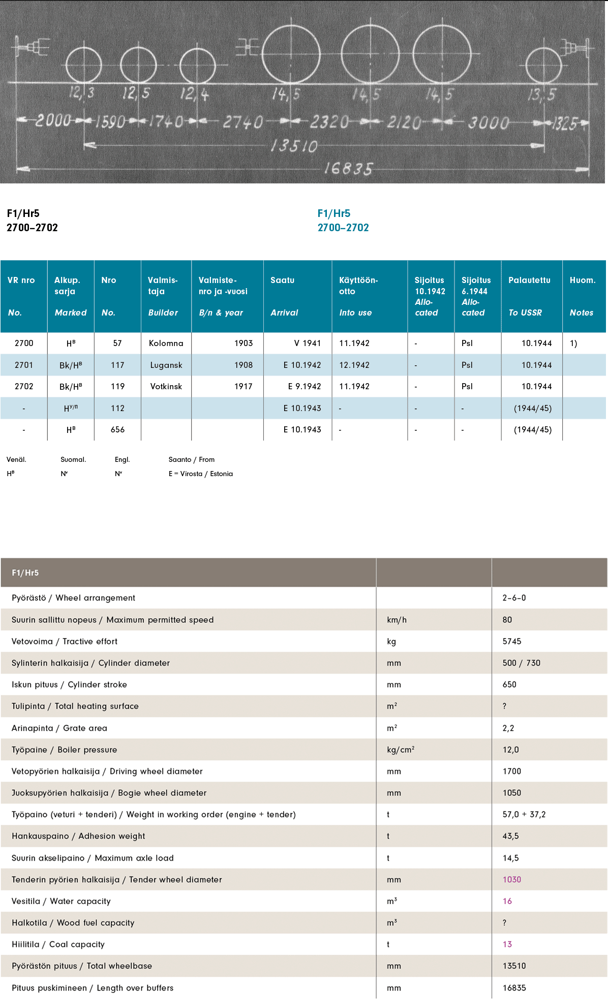 NV (HB) class no. 57 was seized at Unitsa in 1941 during the Finnish military advance. This locomotive was then temporarily utilised by the track repairs division of the army engineering corps and eventually entered the Helsinki railway workshops on 22 April 1942 in a worn out condition. It entered service for the VR in June 1942 as F1 class no. 2700 but was reclassified Hr5 later that year.