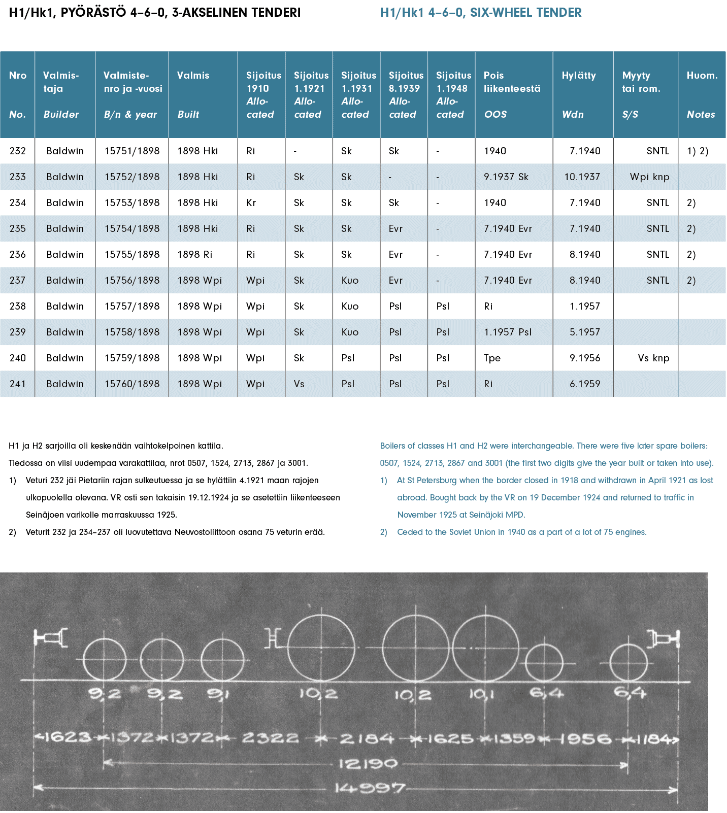 On their introduction, nos. 232–241 were dispatched to Helsinki, Viipuri and Riihimäki loco sheds but they were later in use at St Petersburg, Kouvola and Karjaa, mainly for passenger rosters. Transfers took them to central Finland. The Hk1 class locomotives from this batch to remain in Finland following the Second World War could be found at Seinäjoki, Karjaa, Riihimäki and Helsinki.
